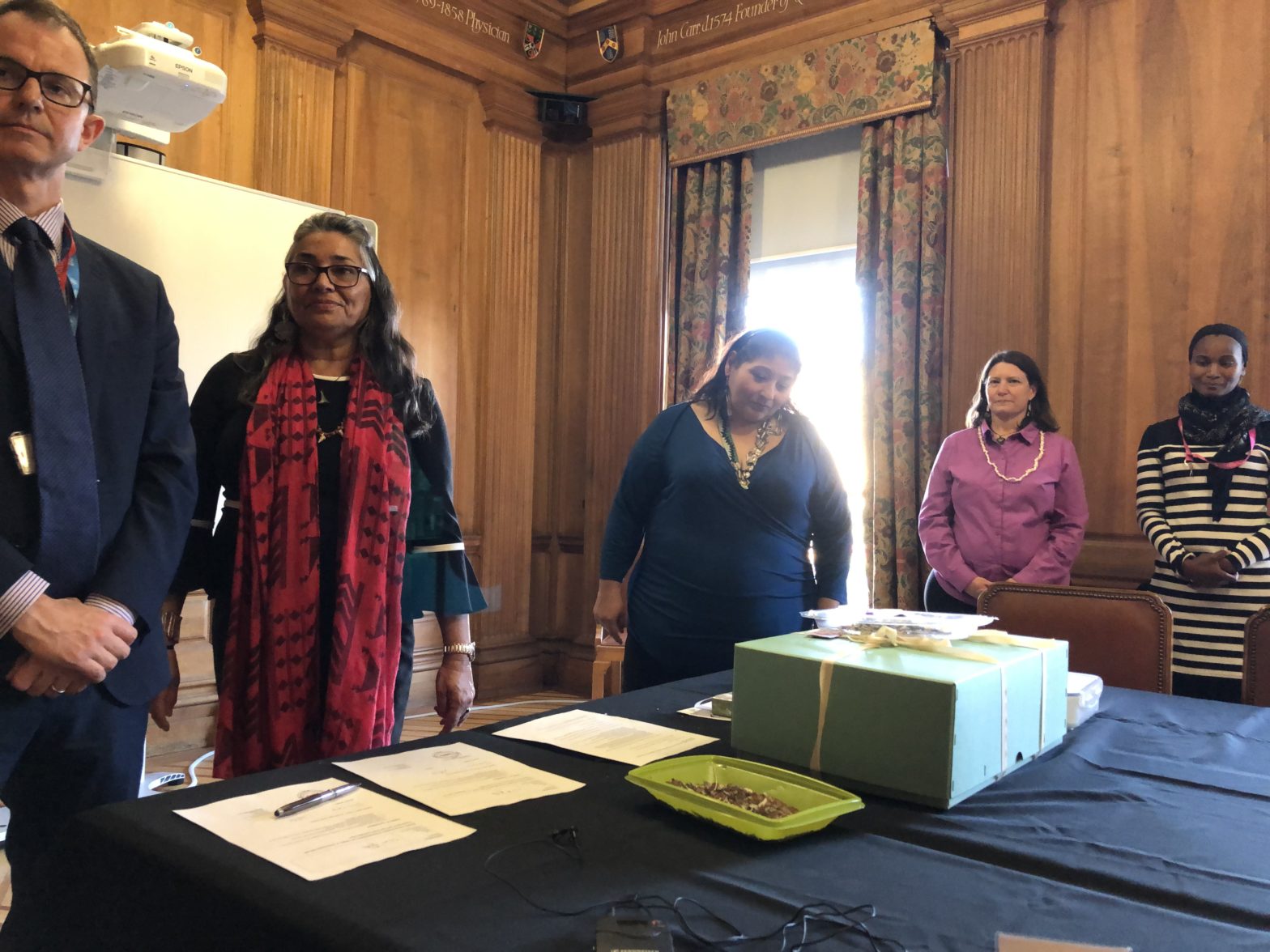 In the afternoon, we were able to schedule the formal transfer of custody for the skulls and materials from the islands to descendant Cindi Alvitre and to hold a public ceremony at Bristol City Hall to honor these Tongva ancestors as they headed home. Wealso honored the long and cordial collaboration between all the curators, archaeologists and others involved, and particularly the support of Mrs. Avalon Eastman, the grand daughter of Alfred Hutchins (the relic hunter), and a stalwart supporter of the film and repatriation project right from the beginning.